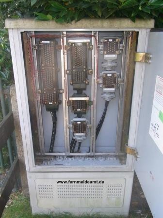 Dieser Schrank steht in der Garage, hier laufen die meisten Außenleitungen auf. Der Verteiler ist mit Klemmen - Endverschlüssen GG bestückt. In der mittleren Bucht befindet sich ein Fernkabelendverschluss der Bundespost, auf ihm ist ein Bleikabel aufgelegt. Auf den beiden linken Endverschlüssen liegen die ankommenden Kabel von der EMD Anlage und vom Hauptverteiler.