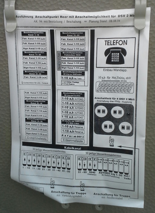 Anschaltkasten 94 der Bundeswehr, ein Nachfolgemodell des AK 65 welchen ich immer noch suche. Der AK 94 war im Gegensatz zum AK65 nur in Liegenschaften der Bundeswehr eingebaut und wurde auf die Fernmeldeanlagen des Standortes abgestützt. Außer dem AK 65 sind alle stationären Anschaltkästen BW in meiner Sammlung vorhanden. Eine Abbildung der Beschriftung im Schrank gibt es hier.