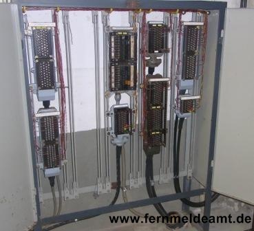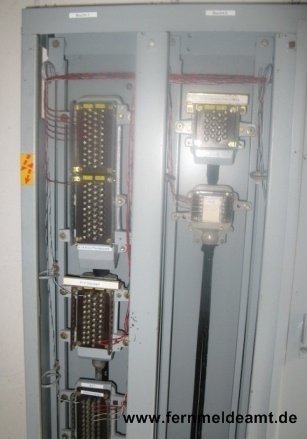 Dieser Schrank steht in der Garage, hier laufen die meisten Außenleitungen auf. Der Verteiler ist mit Klemmen - Endverschlüssen GG bestückt. In der mittleren Bucht befindet sich ein Fernkabelendverschluss der Bundespost, auf ihm ist ein Bleikabel aufgelegt. Auf den beiden linken Endverschlüssen liegen die ankommenden Kabel von der EMD Anlage und vom Hauptverteiler.